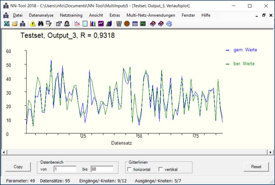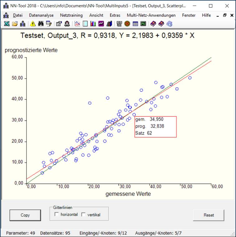 Für jeden Datensatz des Testsets ist hier der berechnete (prognostizierte) gegen den vorgegebenen (gemessenen) Wert der Ausgangsgröße "Output_3" aufgetragen. Darüber hinaus ist die "Winkelhalbierende" (grüne Linie) sowie die Ausgleichsgerade (rote Linie) durch die Punktewolke eingetragen.  Idealerweise sollten alle Punkte auf der Winkelhalbierenden (d.h. auf der Geraden y = x) liegen und die Ausgleichsgerade sollte mit der Winkelhalbierenden übereinstimmen. Auf diese Weise ermöglicht diese Darstellung eine schnelle visuelle Kontrolle der Güte des Netzes, die bei mehr als 2 Eingangsgrößen durch keine andere graphische Darstellung vergleichbar leicht möglich ist. Durch Anklicken der Taste Copy kann die Grafik in die Zwischenablage eingestellt werden und von da aus durch Kopieren beispielsweise in ein Word-Dokument übernommen werden.