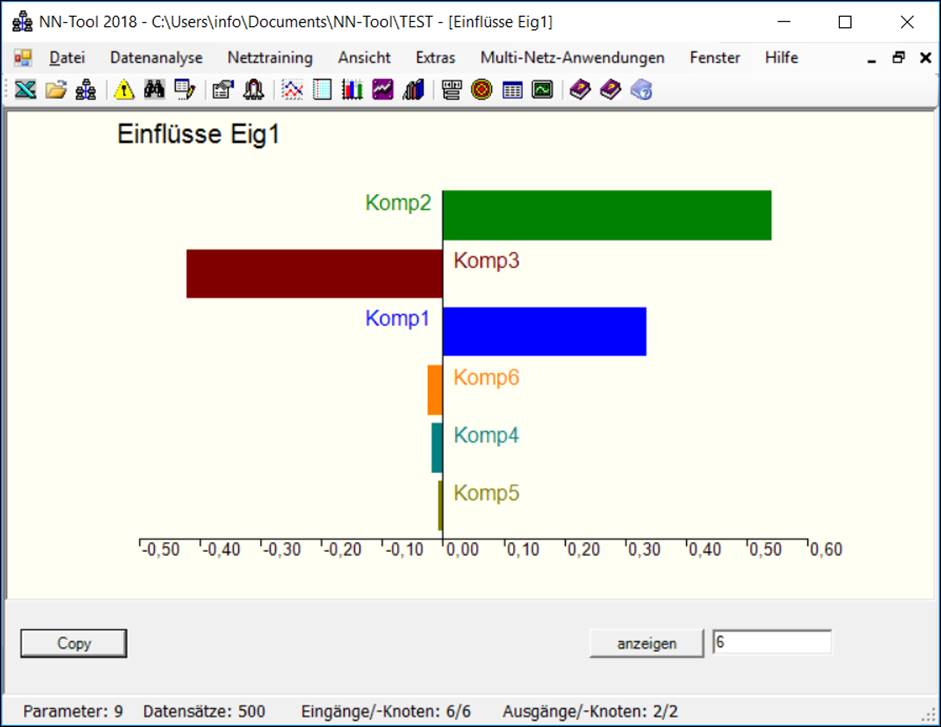 Falls ein hinreichend genaues Modell erreicht worden ist, kann dieses Modell nun zu Analysen des Einflusses der Eingangs- auf die Ausgangsgrößen herangezogen werden. NN-Tool bestimmt den mittleren Einfluss und den mittleren absoluten Einfluss einer Eingangsgröße xj auf eine Ausgangsgröße yi, in dem an allen vorliegenden Datenpunkten die entsprechenden partiellen Ableitungen des skalierten NN-Modells (bzw. die Beträge davon) berechnet und dann gemittelt werden. Alternativ kann die entsprechende Analyse auch an einzelnen Betriebspunkten durchgeführt werden. Die Ergebnisse können tabellarisch oder grafisch ausgewertet werden:
