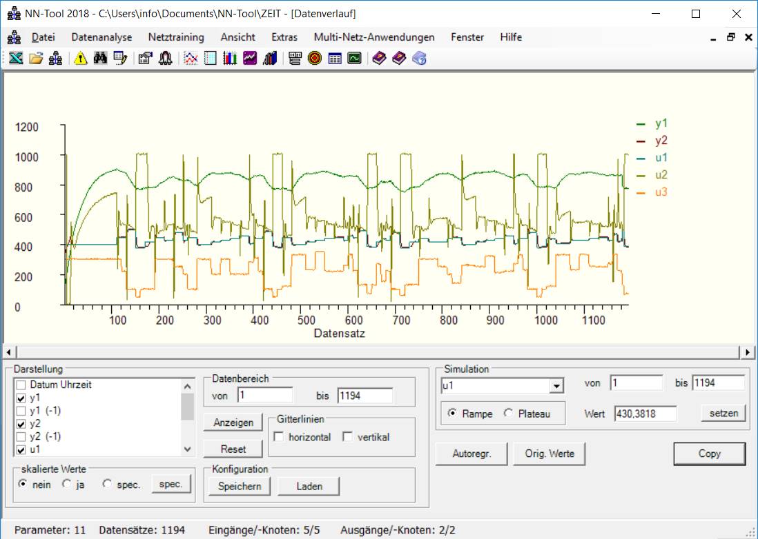 Dieses Anwendungsmodul (siehe auch unter Simulation) dient der Simulation von Zeitreihen. Der Anwender hat die Möglichkeit für die Eingangsgrößen beliebige Zeitfunktionen als Vorgaben zu machen. Das Modul berechnet anschließend auf der Basis des zugrundeliegenden Netzes die Reaktion des betrachteten Systems. Diese Simulationen können in Abhängigkeit des entsprechenden NN-Tool-Modells autoregressiv oder nicht autoregressiv durchgeführt werden. Als Vorgaben können bestehende Messdatendateien (zum Beispiel vom Vortag) geladen werden.